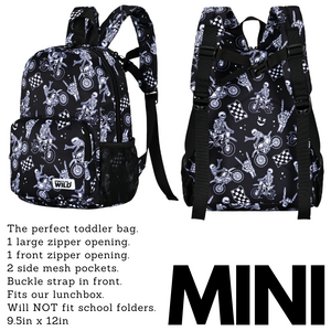 For the little ones or those on-the-go, our mini backpack is the perfect companion. It features one large opening and a front zipper pocket, providing enough space for your toddler's essentials or as a compact travel bag. Inside, you'll find a sleeve opening to keep important items secure. Plus, it has two mesh water bottle holders to keep your little one hydrated.