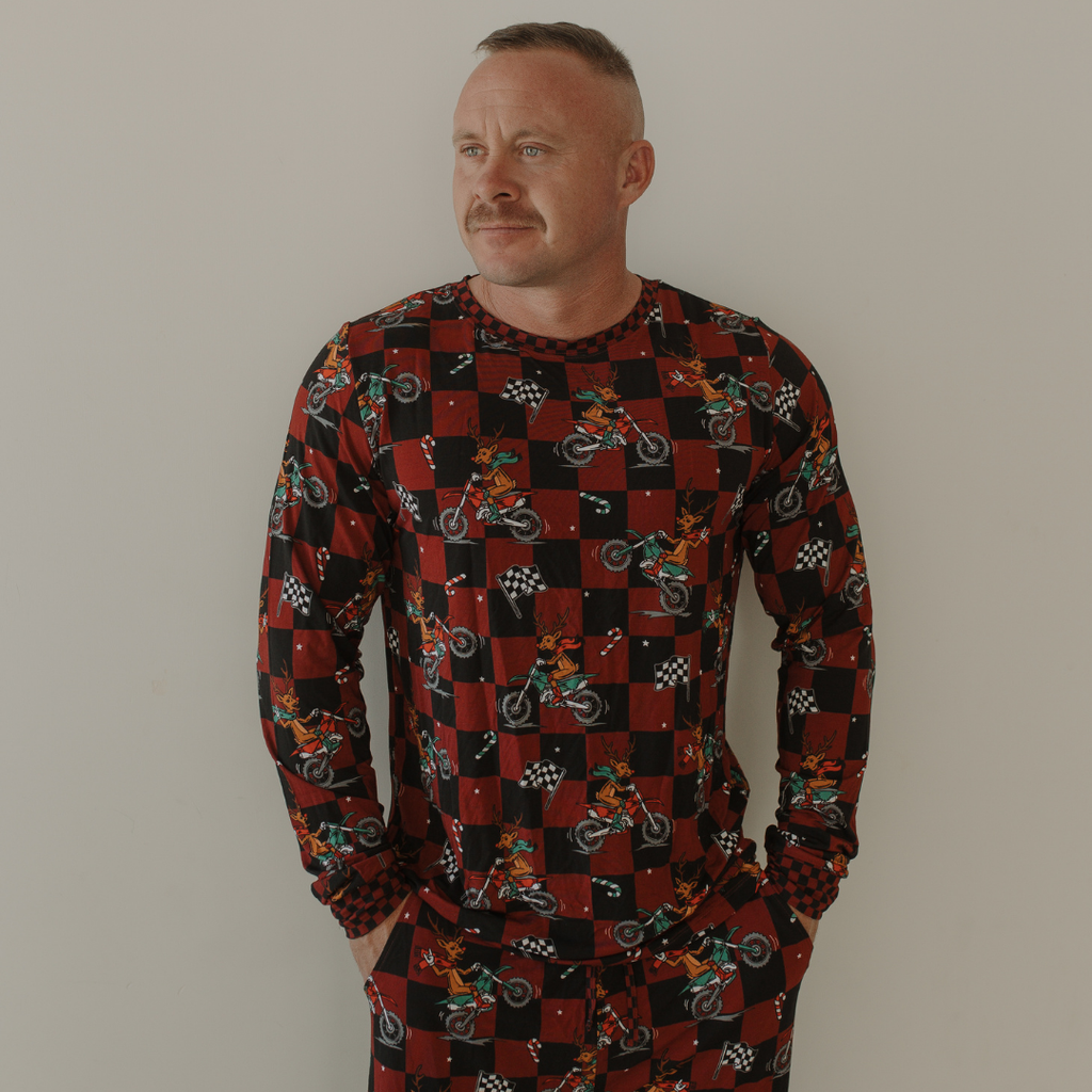 Introducing our "Let's Race Santa" Christmas pajamas, perfect for racing families and sure to make Christmas morning even more magical. This set includes a long sleeve top and pants crafted from the softest bamboo fabric, offering unparalleled comfort.