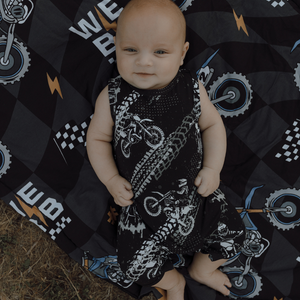 Introducing our Dirt Bike Rompers, the perfect blend of style and comfort for your little one. Crafted with 95% bamboo and 5% spandex, these rompers are not only soft but also durable, making them ideal for active little ones. The tank top/short combo design adds a trendy touch, while the dirt bike print brings a sense of adventure to any race day.